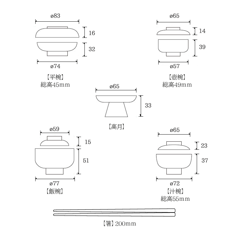 椀4種類・高月・箸・お膳がセットになったお手入れしやすいPC製の供養膳です。