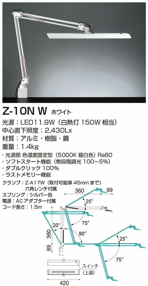 【あす楽】【クーポンで100円値引き】【送料無料】山田照明 Zライト LEDデスクライト Z-Light ホワイト Z-10NW