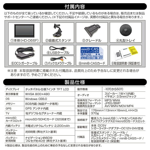 【商品内容】 - 本体 - 吸着式スタンド - クレイドル - 丸型トレイ - DCシガーケーブル - USBケーブル - バックカメラケーブル - mini-B-CASカード - 取扱説明書(保証書付き) 仕様 ディスプレイ : タッチパネル仕様 7インチ TFT LCD 表示解像度 : WVGA 800×480 OS : Windows CE 6.0 メモリー : 8GB内蔵(地図データ専用) GPS : GPSアンテナ内蔵 TV : 地デジフルセグチューナー内蔵 拡張スロット : microSD/SDHCカード(32GBまで) 内蔵バッテリ : 充電式リチウムバッテリ 2200mAh バッテリー充電時間 : 約8時間(弊社テスト基準) バッテリー使用時間 : ナビゲーション約60分 フルセグ約40分(弊社テスト基準) 動作環境 : -10℃から50℃ オーディオ : [スピーカー] 1W×1(内蔵)、イヤホン:3.5mmジャック 音楽再生フォーマット : MP3/WMA 写真表示フォーマット : JPEG/BMP 動画再生拡張子 : AVI / WMV / MOV / MP4 製品サイズ : 176mm×113mm×16mm(L×H×D) 本体重量 : 370g 接続端子 : 電源入力(miniUSB)/イヤホン/CAM-IN/Ext.TVアンテナ×2/microSDカードスロット 駆動電圧 : [本体] DC5V、シガーライターアダプターDC12V-24V定格 配送 宅配便(送料無料) 保証 保証期間 … 1年 ※ 商品の入荷時期により、色合いなどが変わってきます。